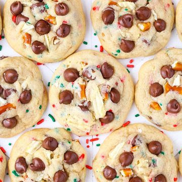Gently fold in most of the potato chips, pretzels, chocolate chips, and sprinkles (reserve some for pressing on tops of cookies).